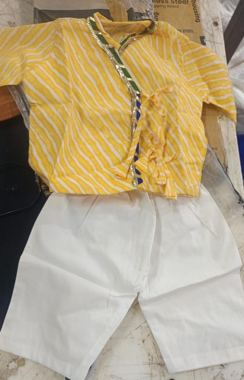 Boys Yellow White Leheriya Print Kurta Pajama Pants Size 3 To 6 Month