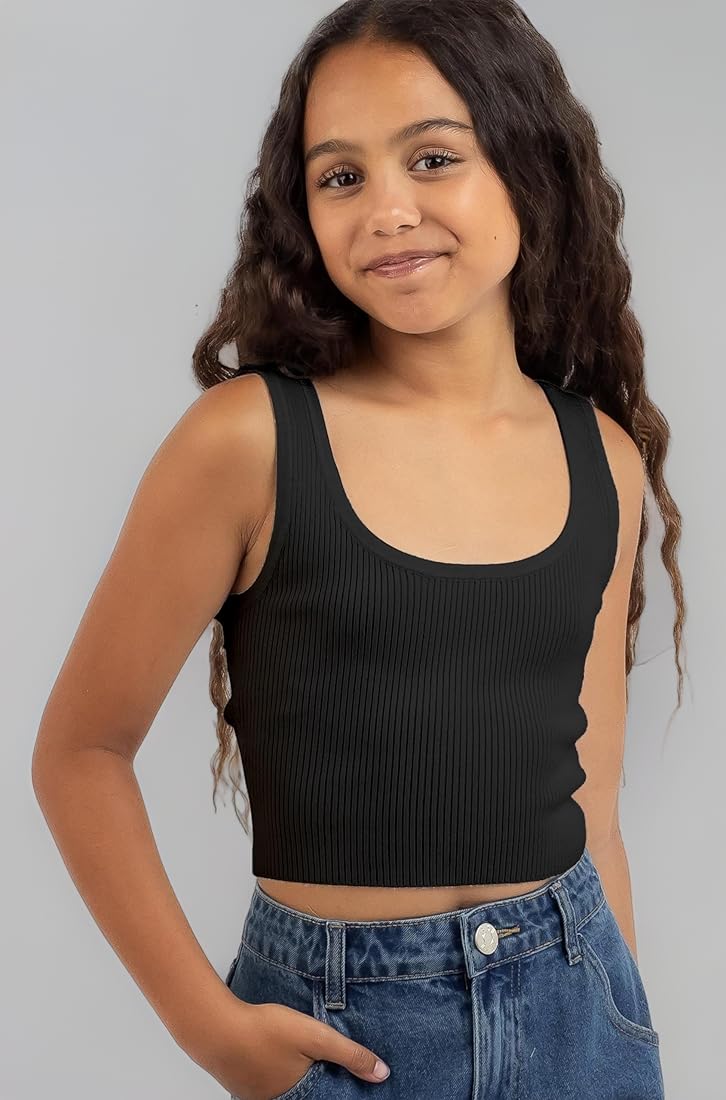Casual Sleeveless Solid Cotton Rib Neck Crop Tank Top For Girls Black Size M