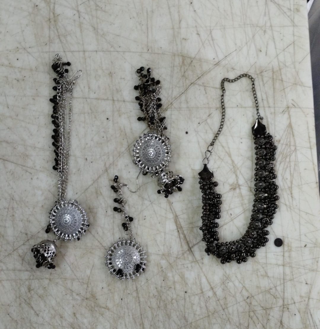 Ethnic Silver Plated Tribe Style Jhumka Earrings With Mangtika And Necklace