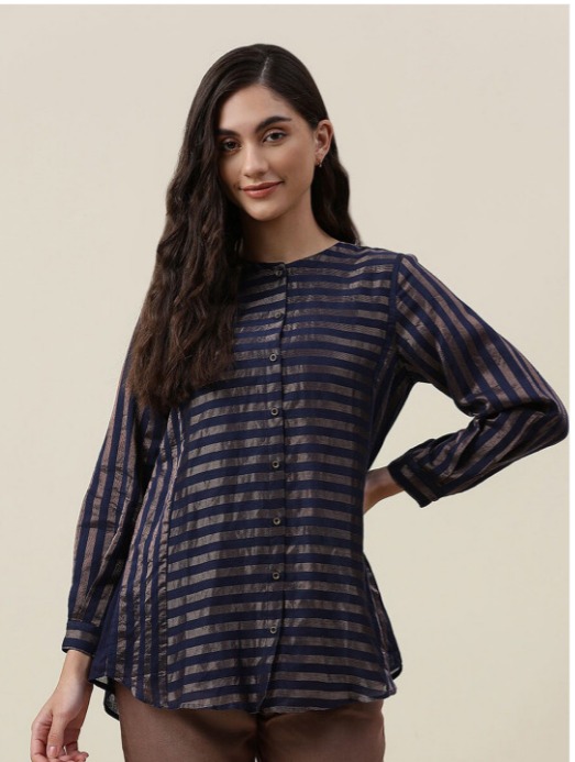 Fabindia Blue Gold Toned Cotton Striped Tunic Size S