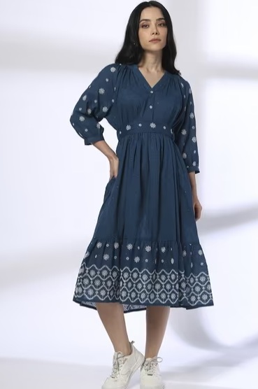 FUSION Women Schiffli Embroidered Fit AND Flare Dress medium blue S