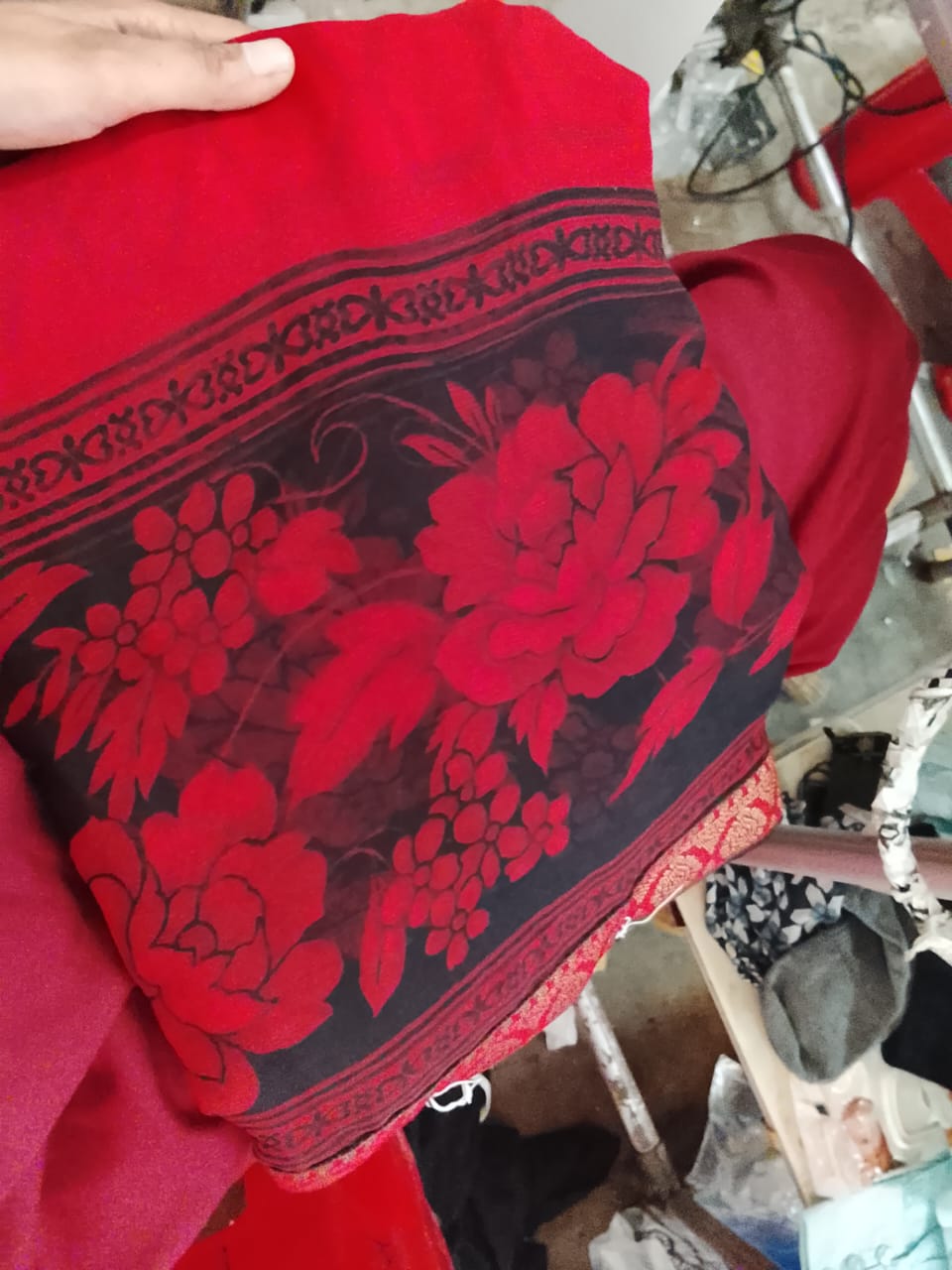 Georgette Printed Saree Red And Black Colour