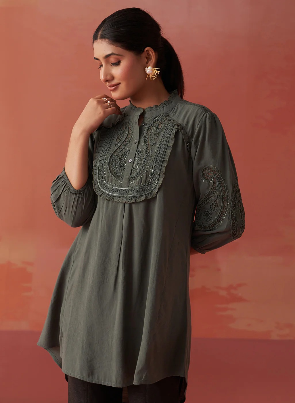 Lakshya Saba Army Green Cotton Linen Embroidered Top For Women Size Xl