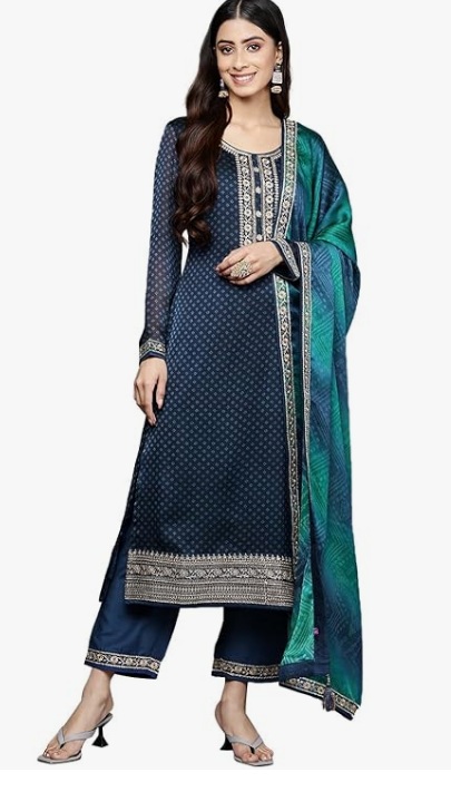 Libas Womens Printed Chiffon Straight Kurta With Trousers and Dupatta size L navi blue colour