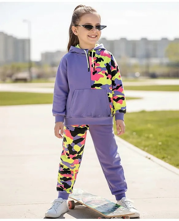 OLLINGTON ST Cotton Looper Knit Full Sleeves Sweatshirt Hoodie Knit Joggers with Camouflage Print Multicolor Purple Size 2 To 3Y