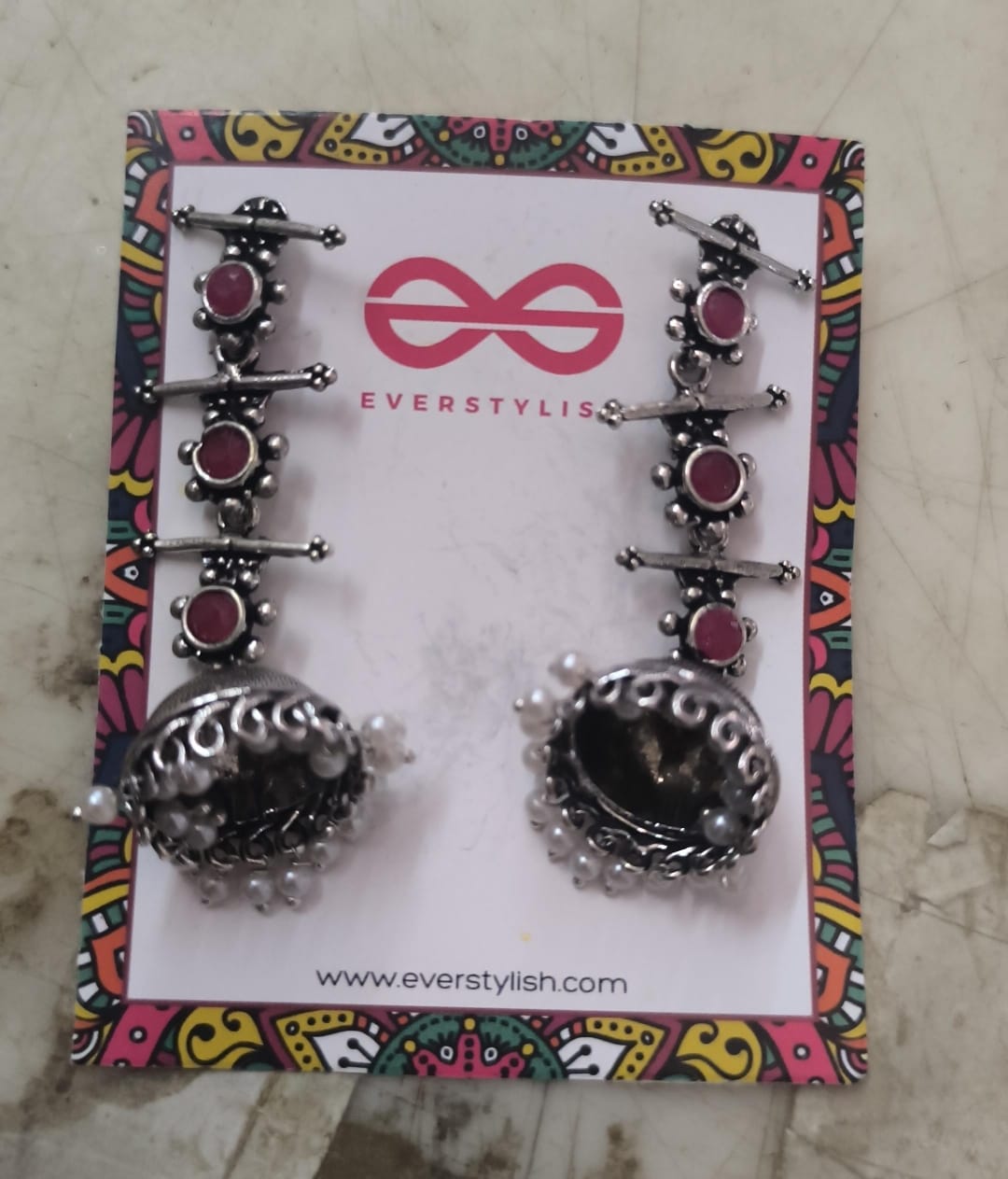 Oxidised Silverplated Maroon Handcrafted Stonestudded Circular Drop Earrings