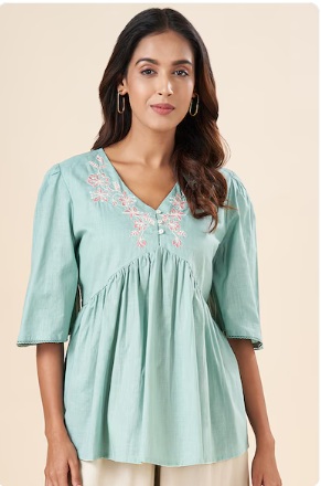 Pantaloons Aqua Embroidery Cotton Slub V Neck Women Regular Fit Tunic M
