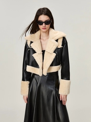 Patchwork Faux Leather Coat Black Colour L size