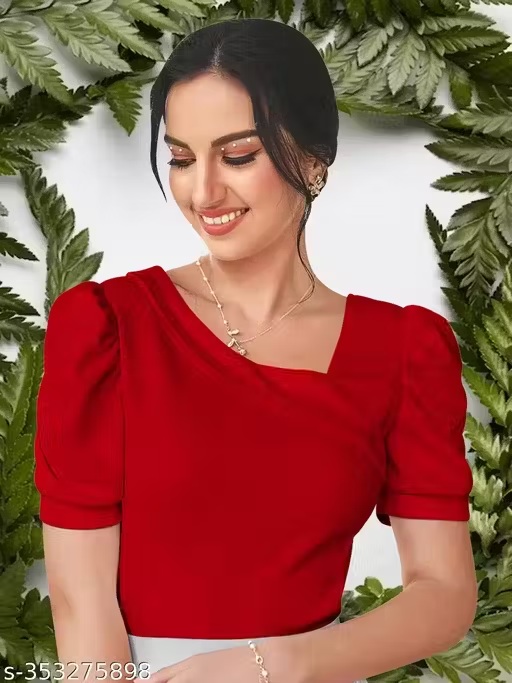 Private Label Casual Polyester Blend Puff Sleeves Asymmrtrical Neck Red Stylish Top Red Colour Free Size