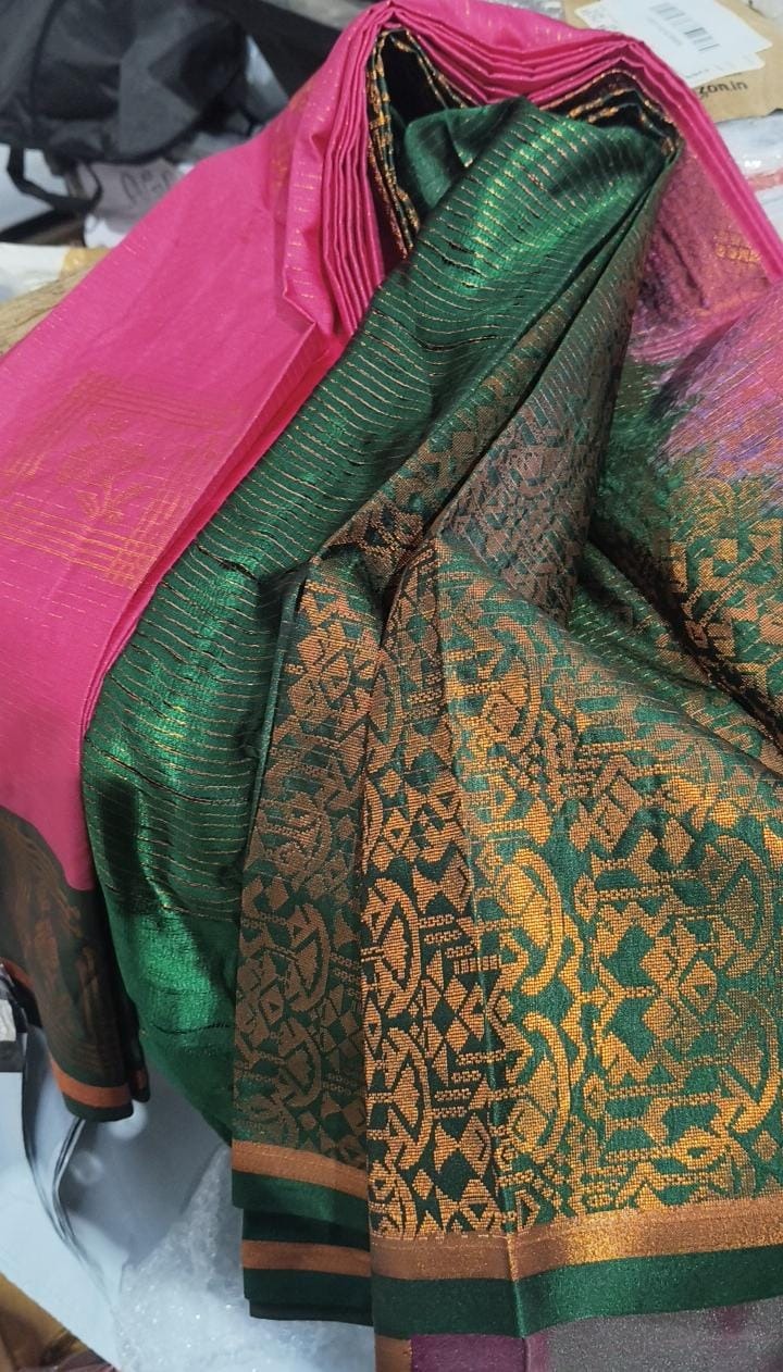 Private Lable Woven Banarasi Art Silk Silk Blend Saree Pink Green
