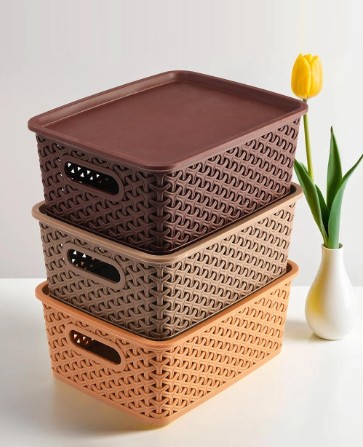 Privet Label Beige Brown Green 3 Pieces Multipurpose Storage Basket With Lid