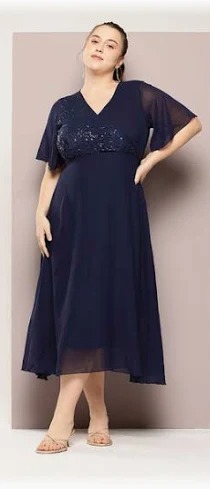 Qurani Flared Sleeves Sequined Georgette A Line Midi Dress Size Xl Navy Blue