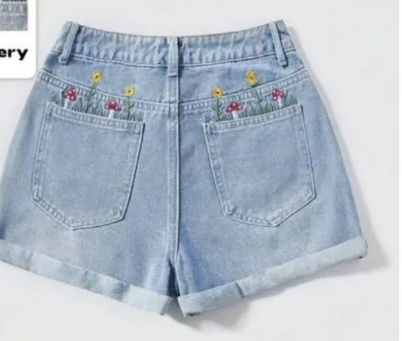 Savana Blue High Waist Cute Mushroom Sunflower A Line Rolled Hem Denim Shorts Size Xs