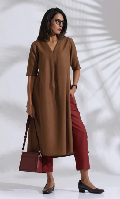 TrueBrowns Brown Slub Highslit Kurta Set SIZE 2XL