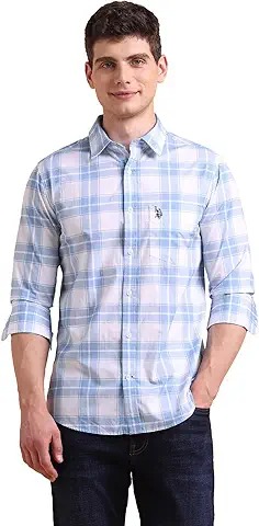 UPointSPoint POLO ASSNPoint Men Cotton Tailored Fit Windowpane Checked Shirt Size S Blue Color
