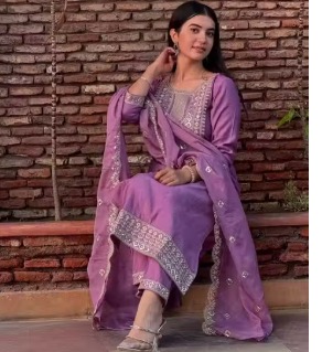 VredeVogel Women Lavender Ethnic Motifs Embroidered Sequinned Kurta with Trousers Dupatta 2XL