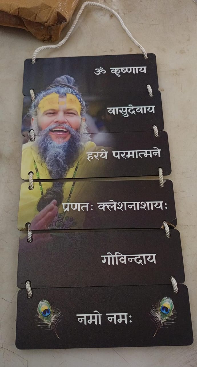 Wall Hanging Featuring A Picture Of Premanand Ji Maharaj And A Sanskrit Mantra
