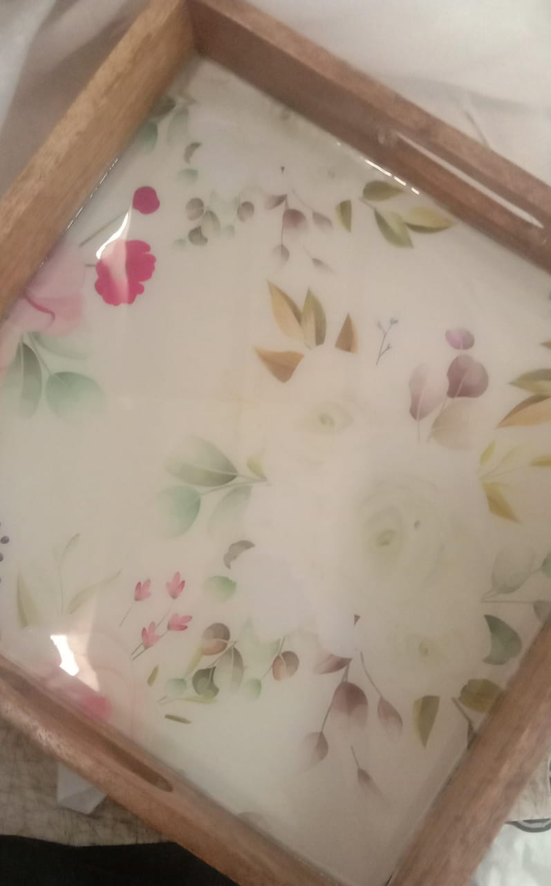 Wooden White Floral Printed Tray